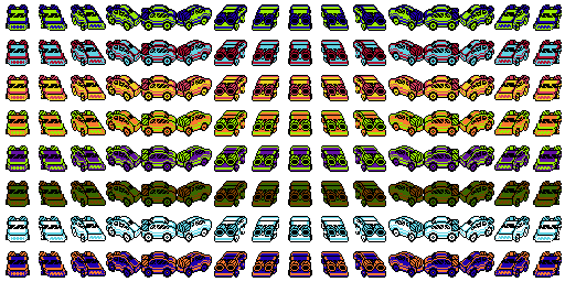 The most important direction I set for myself on this was sticking to vibes. Using the four-color (well 3+alpha) limitation and limited separate palette use. There’s a few spots where I cheated a bit and maybe got in an extra color, but hey it was done in three weeks. I was hooting and hollering when I got some features in like those boost trails and the cars rotating, and then there were other bits where I said good enough (like how the cars can’t collide lol).