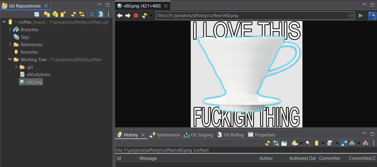 You can see for my Coffee repository that the v60 source file and exported PNG file are listed, and as a neat bonus if I double-click the PNG it’ll be displayed inside Minimal EGit in a new tab. You can also do this with text files!