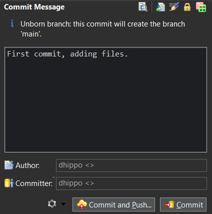 Enter a commit message, something to describe what we’re doing. “First commit, adding files.” will do fine. For the Author and Committer text fields, you can enter in your name or a username, then follow that up with an email address inside brackets. Let me tell you that when it comes to a local repository, this does not matter. Here I’ve used a short handle for a username, and two empty brackets (<>) for an email address. Select Commit, and you will have created your very first checkpoint in this repository. Congrats!