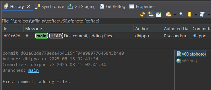 Also, how many changes are worthy of a commit is up to you. You can use commits as large checkpoints, or make a small commit each time you edit a layer in an Affinity document. It’s up to you how you want to record the changes made. Do keep in mind that the more commits you make, the more space the repository will take up on your storage device.