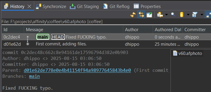 Whoops! Turns out the word FUCKING in that coffee image is misspelled! It’s an easy mistake. I’ve reopened the Affinity source file, fixed the typo, and saved the source file.
