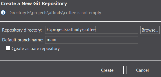 In this next window, you will be prompted with a default value in the “Repository directory” text field. Select the “Browse…” button, then locate your project directory. For my coffee project files, I selected the folder they are in. Leave the default branch as “main”, then click Create.