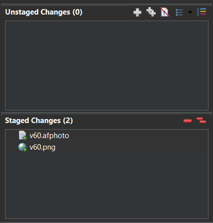 Find the “Git Staging” tab. This should be in the same group of tabs as “History” and “Synchronize” on the right half of Minimal EGit. In it, you’ll see the files that were in the directory you selected in the “Unstaged Changes” section of the Git Staging tab. Select the files you want to be versioned (I’m selecting the source file and PNG), then select the green Plus button to add them to the Staged Changes list. You can also click the green double-plus button to add all listed files.